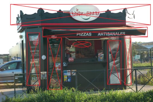 - Retirer toute la frise située au dessus du kiosque ainsi que l'enseigne ovale située en haut au milieu